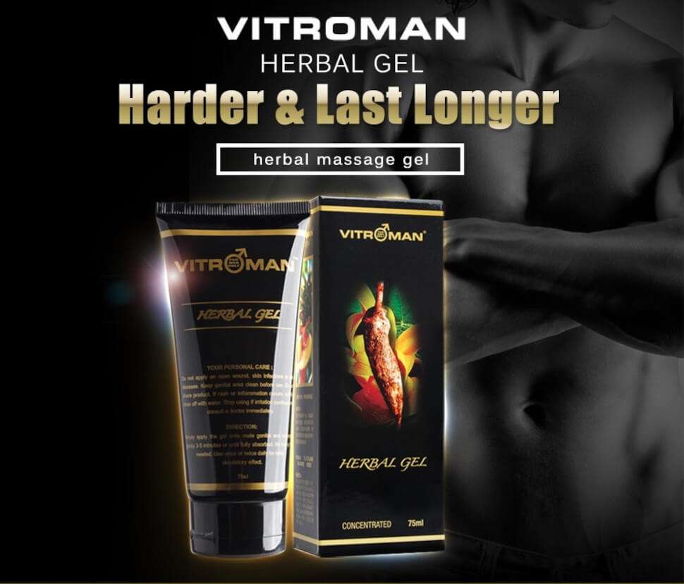 Bahan aktif utama Vitroman Herbal Gel ialah Butea Superba, herba berharga Thailand. Ia adalah gel semula jadi dan menenangkan; sedikit dan tidak berminyak. Sama seperti pelincir, ia tidak mengganggu dan sesuai untuk kegunaan biasa. Ia adalah penembusan pertama kepada ubat-ubatan oral biasa dan suplemen, telah merealisasikan impian ramai lelaki. Mencapai; kesejahteraan kesihatan, perlindungan kesihatan dan penyelenggaraan kesihatan untuk alat sulit.